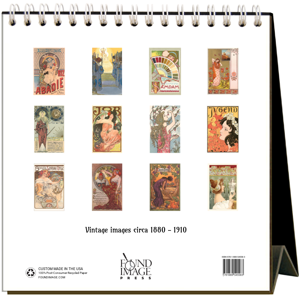 Travel back in time to the exquisite Art Nouveau era.  This easel desk calendar features elaborate examples of posters and advertisements from 1880 to 1910.  Lovely ladies, floral patterns, and flowing designs abound.  The calendar is 6 x 7 x 3 when expanded and is printed on 100% post-consumer recycled, acid-free, natural white, heavy cardstock.  Made in the USA!
