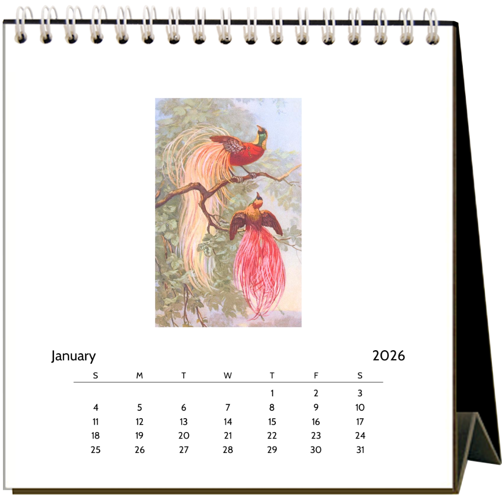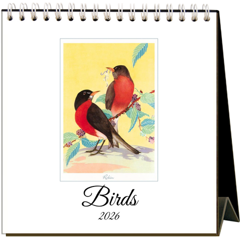 This Birds easel desk calendar features 12 colorful vintage illustrations (1910 - 1960) of birds in the wild.  Robins, quail, gulls, roosters, cardinals, orioles, pelicans, and more — enjoy the bird of the month with this calendar perched on your desk.  Printed on 100% post-consumer recycled, acid-free, natural white, heavy cardstock, the calendar is 6” x 7” x 3” when expanded, and is made in the USA.