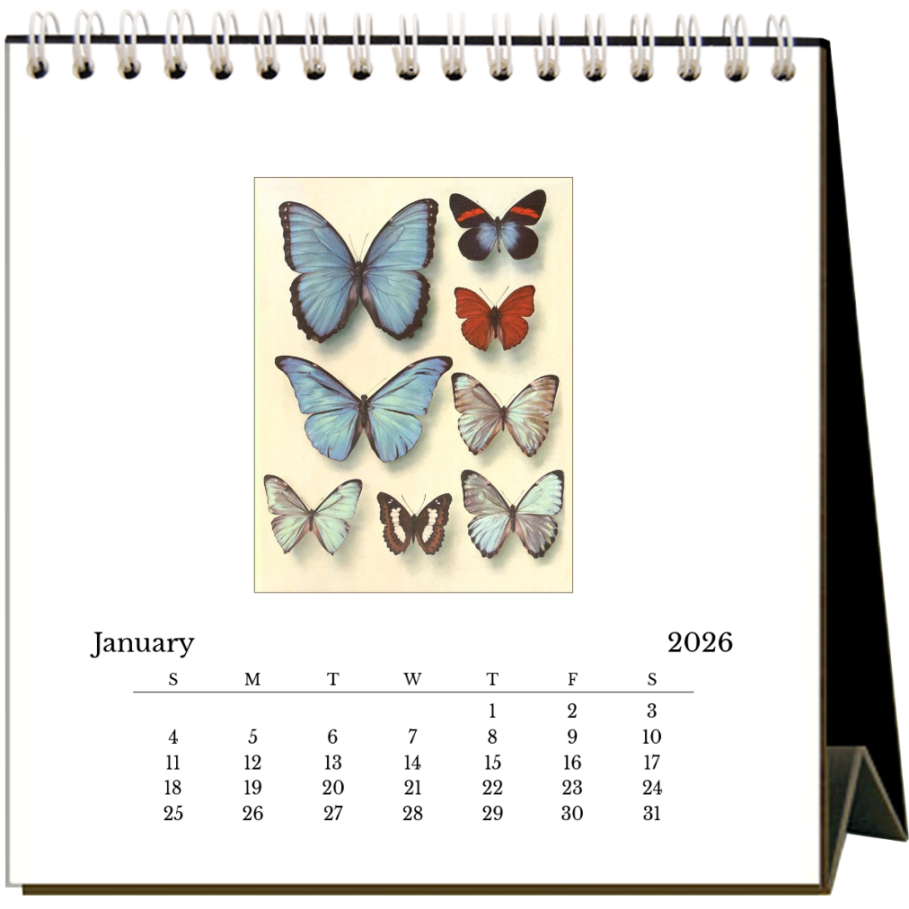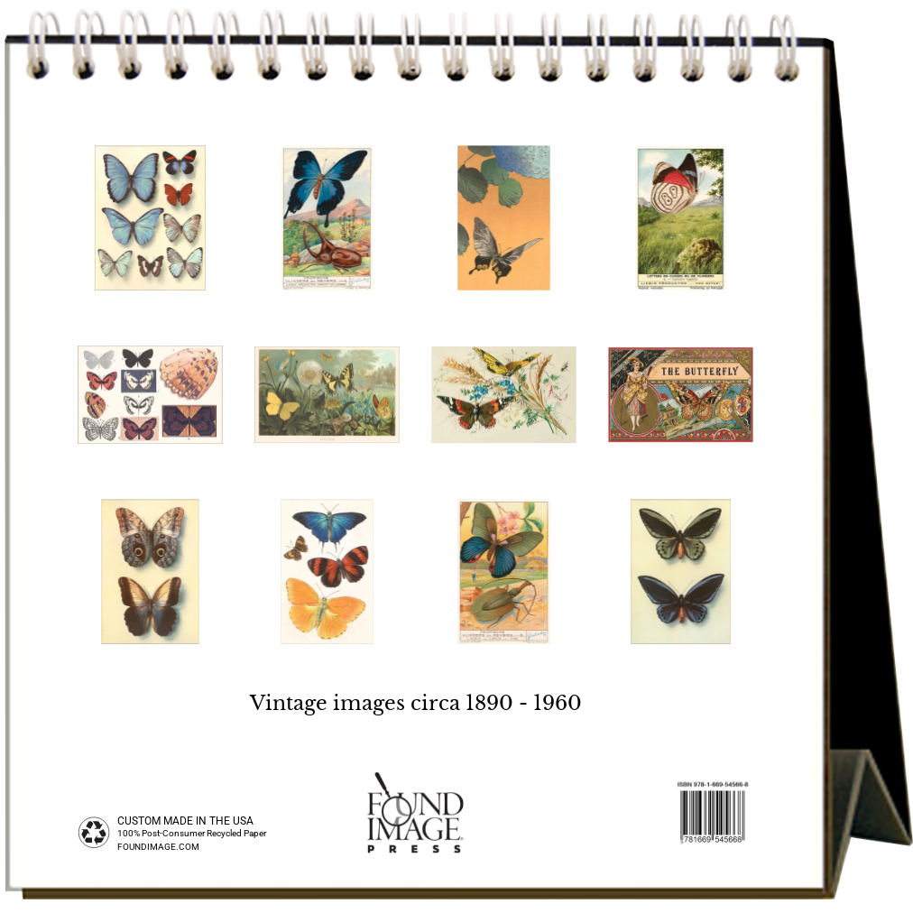 What a nice surprise to suddenly find a variety of colorful Butterflies flitting from one blossom to the next! Lovely, enchanting, vibrant butterflies float across each page of this easel desk calendar that features 12 vintage images from 1890 to 1960. The calendar is printed on 100% post-consumer recycled, acid-free, natural white, heavy cardstock, and measures 6” x 7” x 3” when expanded. Made in the USA.