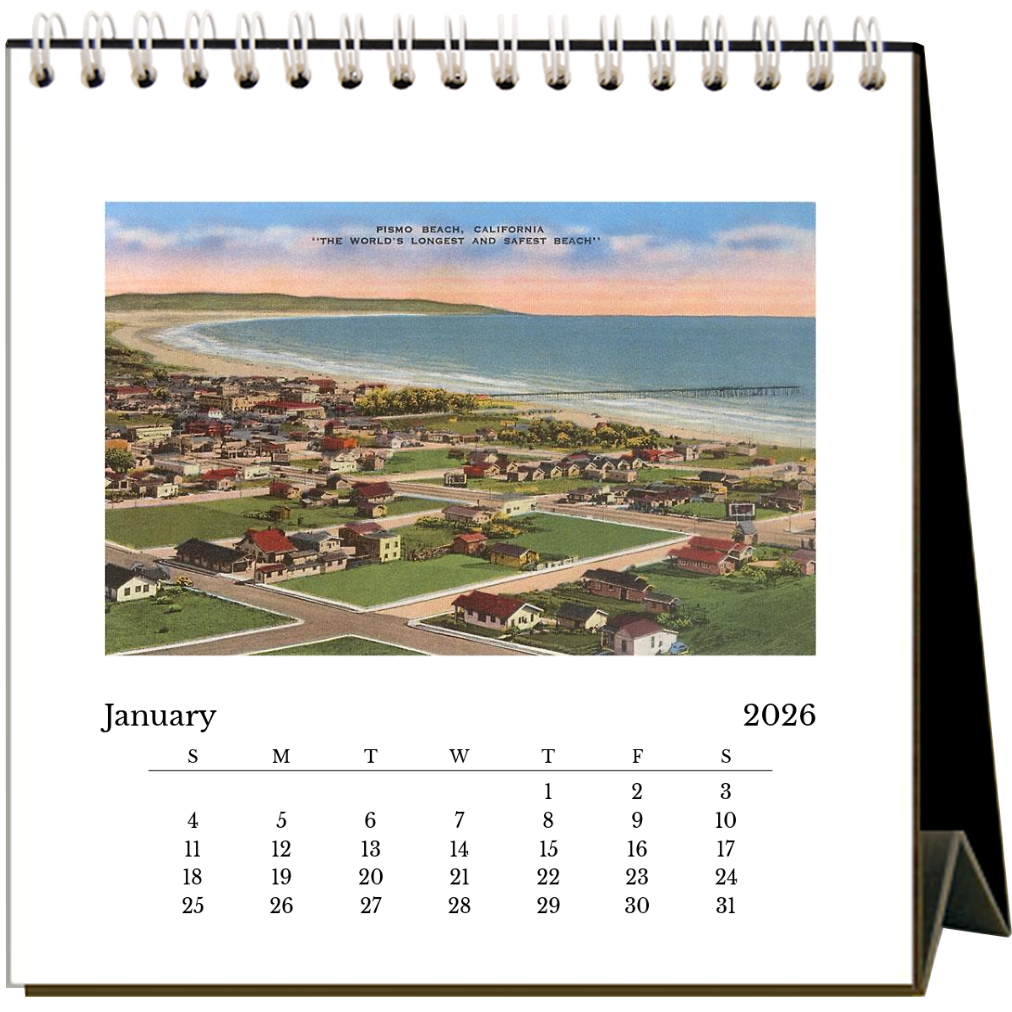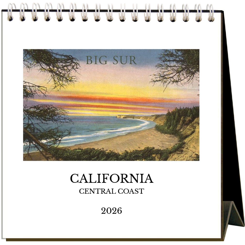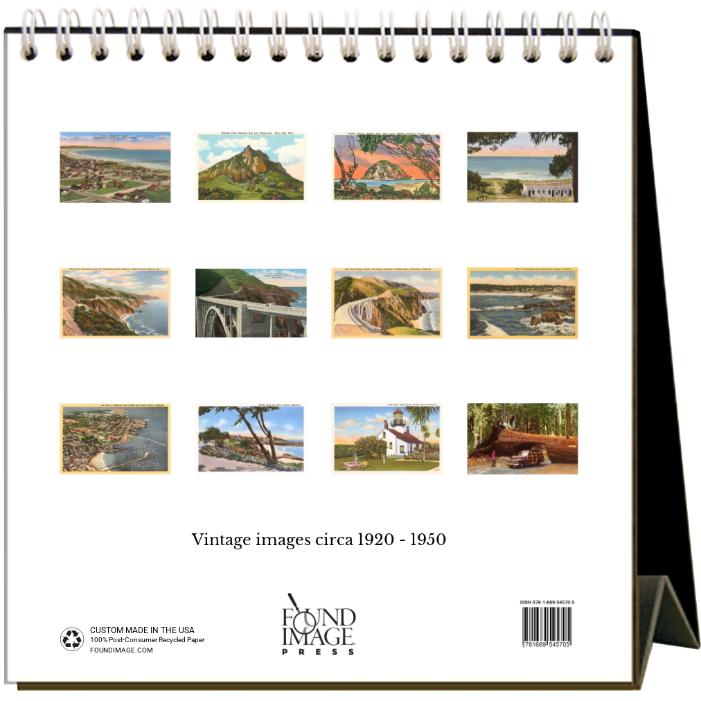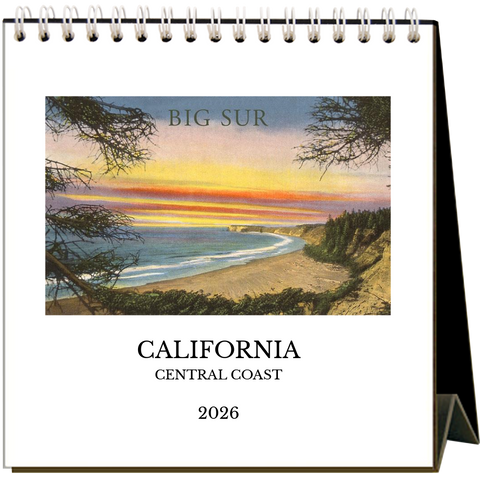 The California Central Coast beckons you with its crashing waves, picturesque coastlines, beautiful bridges, and secluded beaches. Visit Big Sur, Pismo Beach, Cambria, Morro Rock, Bixby Creek Bridge, Point Pinos Lighthouse, Carmel, and Monterey. Featuring 12 vintage postcard images from 1920 to 1950, the calendar is 6” x 7” x 3” when expanded and is printed on 100% post-consumer recycled, acid-free, natural white, heavy cardstock. Made in the USA.