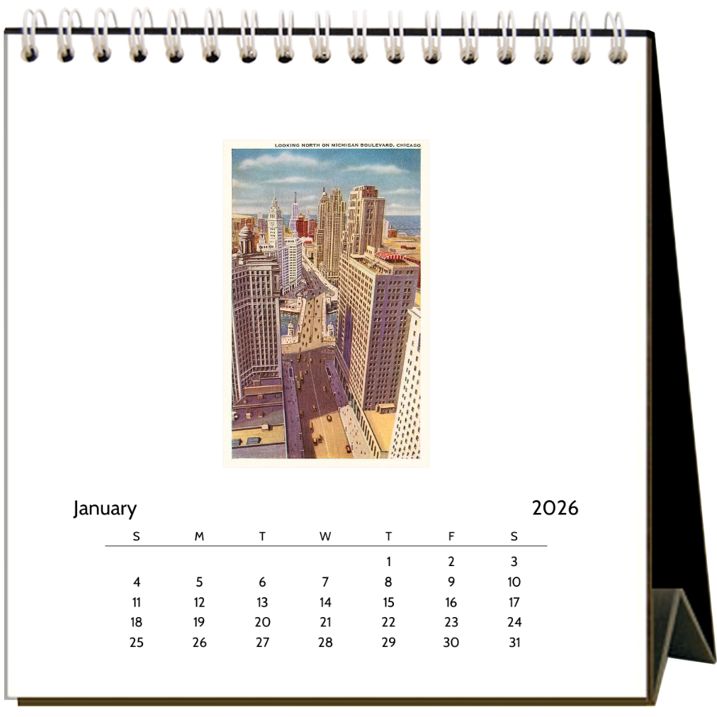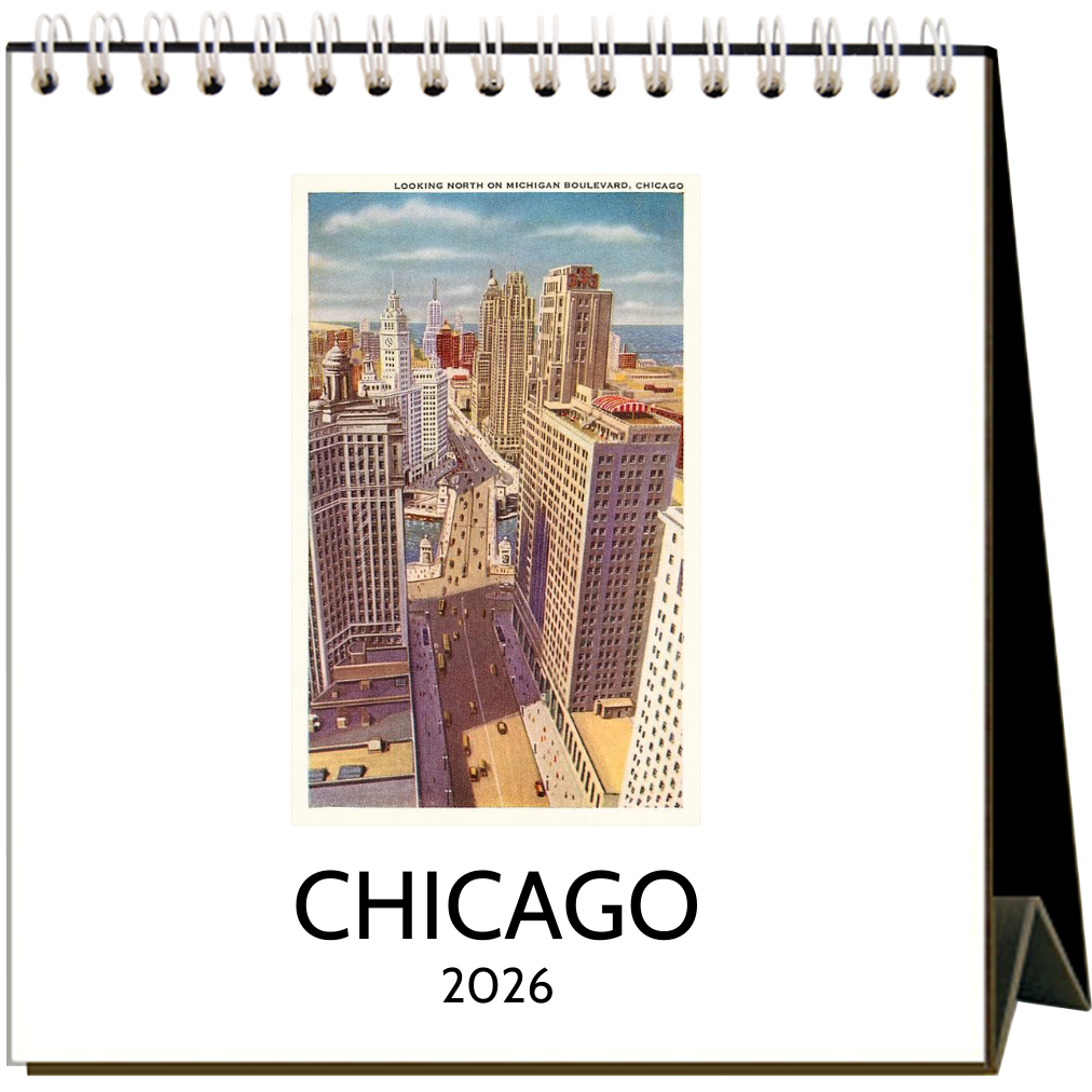 Visit Chicago, the Windy City with this easel desk calendar perched on your desk. Featuring 12 vintage images (1920 - 1940) of Michigan Ave, Humboldt Park, South Shore Drive, Lincoln Park, Oak Street Beach, the Art Institute, Adler Planetarium, and more, the calendar is 6” x 7” x 3” when expanded and is printed on 100% post-consumer recycled, acid-free, natural white, heavy cardstock. Made in the USA!