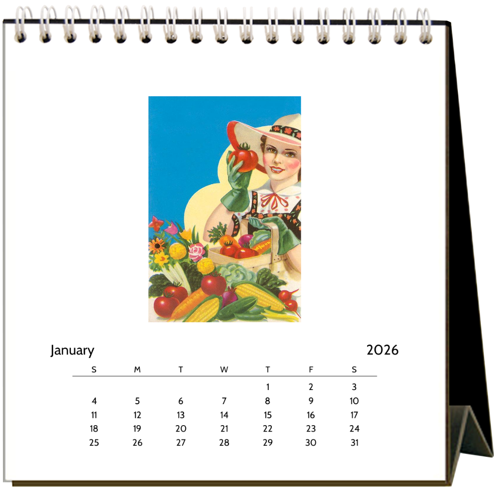 This Farm Fresh easel desk calendar celebrates fresh food and farming with 12 vintage images (1910 - 1960) of succulent fruits and vegetables, friendly farm animals, silos, barns, and fields. Printed on 100% post-consumer recycled, acid-free, natural white, heavy cardstock and measuring 6” x 7” x 3” when expanded, this calendar will whet your appetite for good healthy food. Made in the USA.