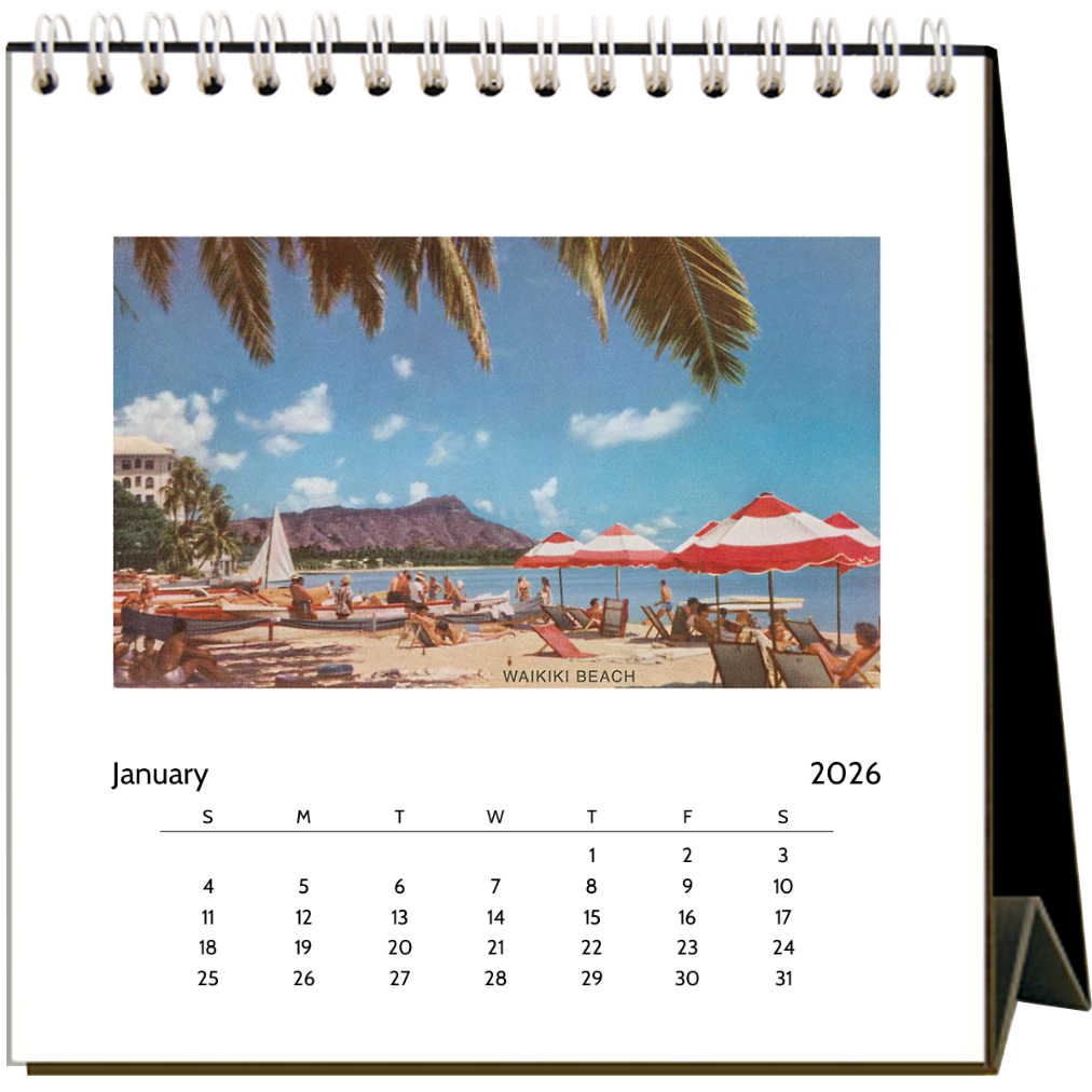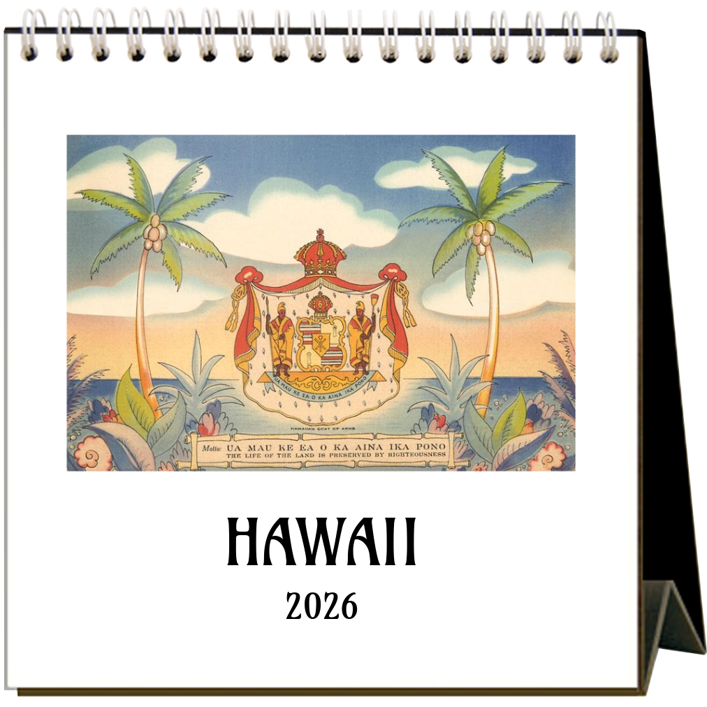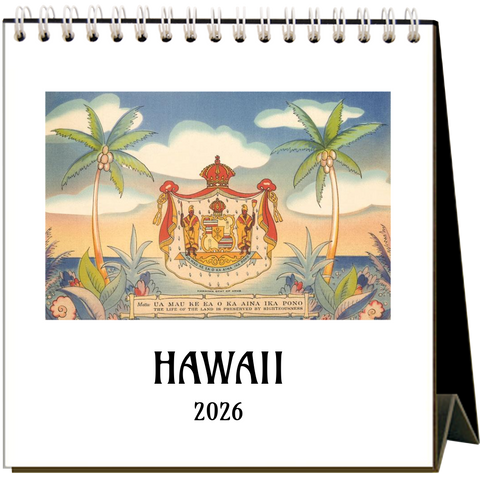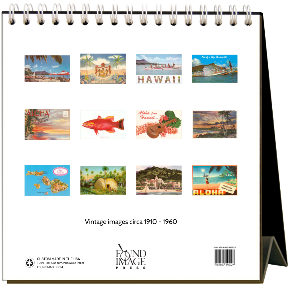 Take a trip back in time to the tropical wonderland of Hawaii, circa 1910 – 1960. This easel desk calendar features vintage images of classic Hawaiian icons -- beaches, surfers, outriggers, ukeleles, colorful fish, and more. The calendar measures 6” x 7” x 3” when expanded and is printed on 100% post-consumer recycled, acid-free, natural white, heavy cardstock. If you can't make the trip, this calendar is the next best thing. Made in the USA!