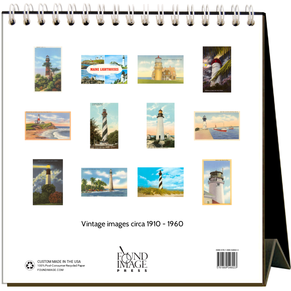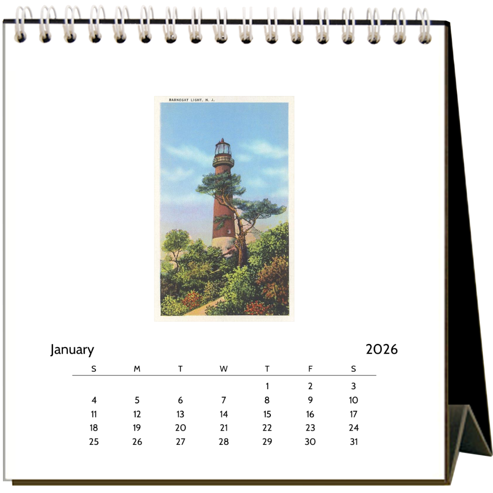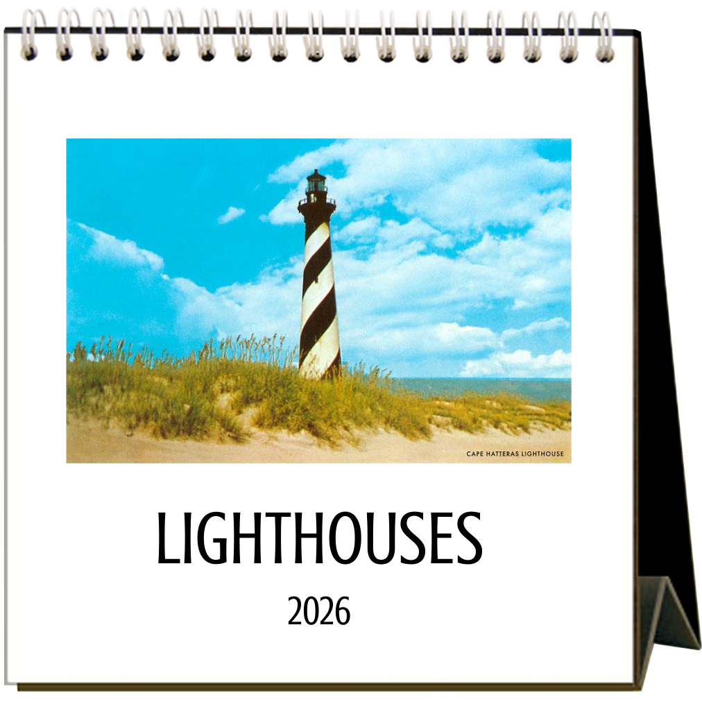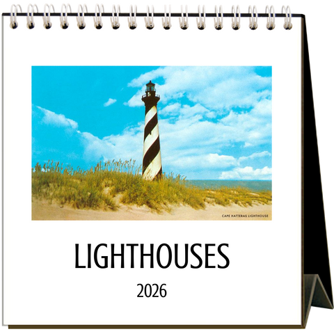 This Lighthouses easel desk calendar celebrates the noble towers that stand alone at water's edge, warning of peril and promising safe harbor. Enjoy the iconic romantically alluring lighthouses of Maine, Massachusetts, Key West, Texas, New York, New Jersey, North Carolina, Florida, Gerogia and more with this easel calendar perched on your desk. Printed on 100% post-consumer recycled, acid-free, natural white, heavy cardstock, the calendar measures 6” x 7” x 3” when expanded. Made in the USA!