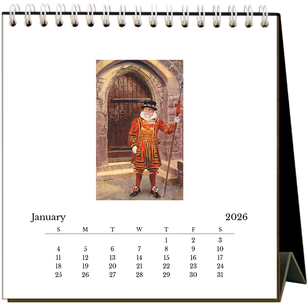 London’s calling!  This easel desk calendar features 12 vintage images of London, circa 1880 - 1970.  It measures 6” x 7” x 3” when expanded and is printed on 100% post-consumer recycled, acid-free, natural white, heavy cardstock.  London Tower, Buckingham Palace, Piccadily, the Sphinx on the Thames, Beefeaters, bobbies, and double-decker buses — this calendar has it all.  See the London of yesteryear without leaving your desk!  Made in the USA.