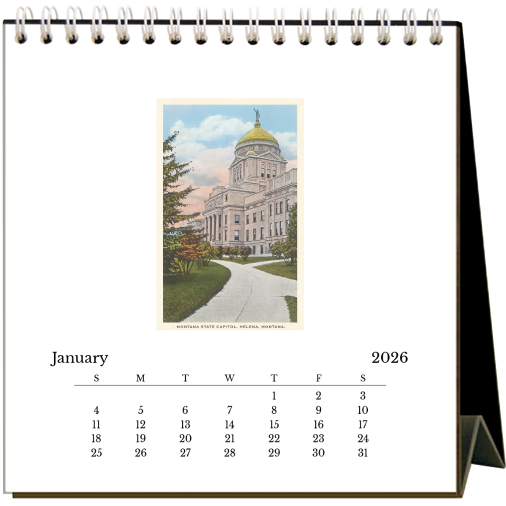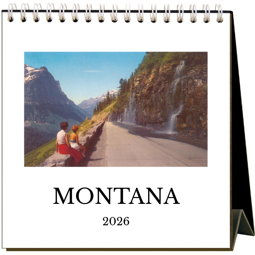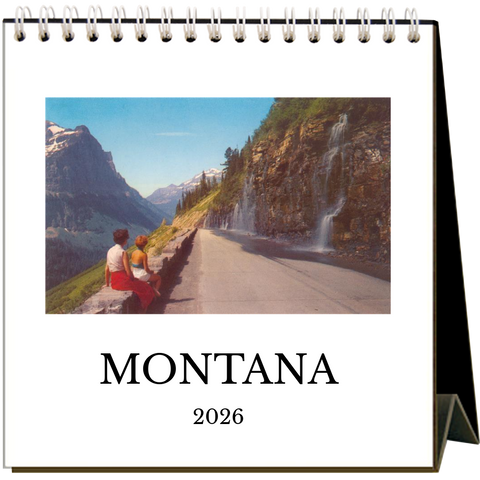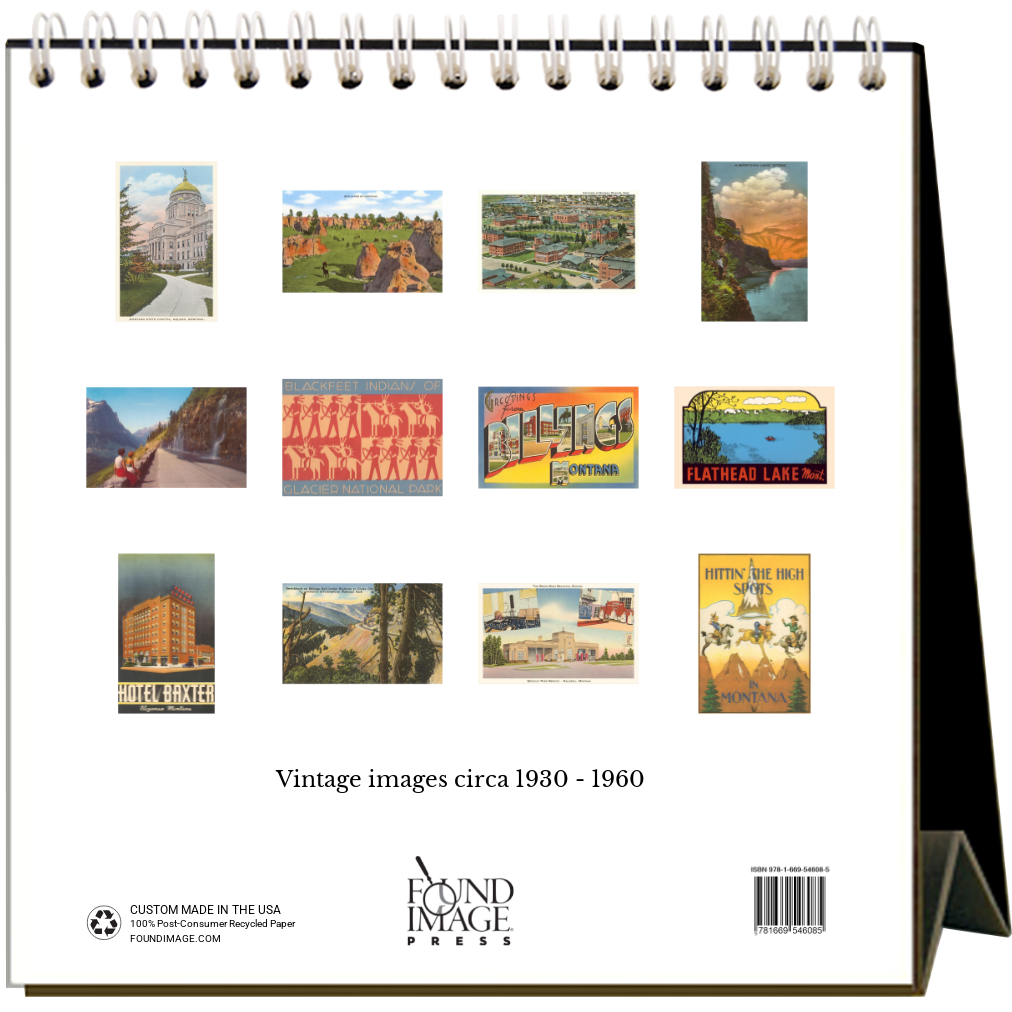 The natural beauty of Montana calls! This easel desk calendar features 12 vintage images of Montana from 1930 to 1960. The calendar is 6” x 7” x 3” when expanded and is printed on 100% post-consumer recycled, acid-free, natural white, heavy cardstock. Visit Glacier National Park, Flathead Lake, Kalispell, Billlings, Helena, and the Univeristy of Montana in Missoula, all while daydreaming at your desk. Made in the USA!
