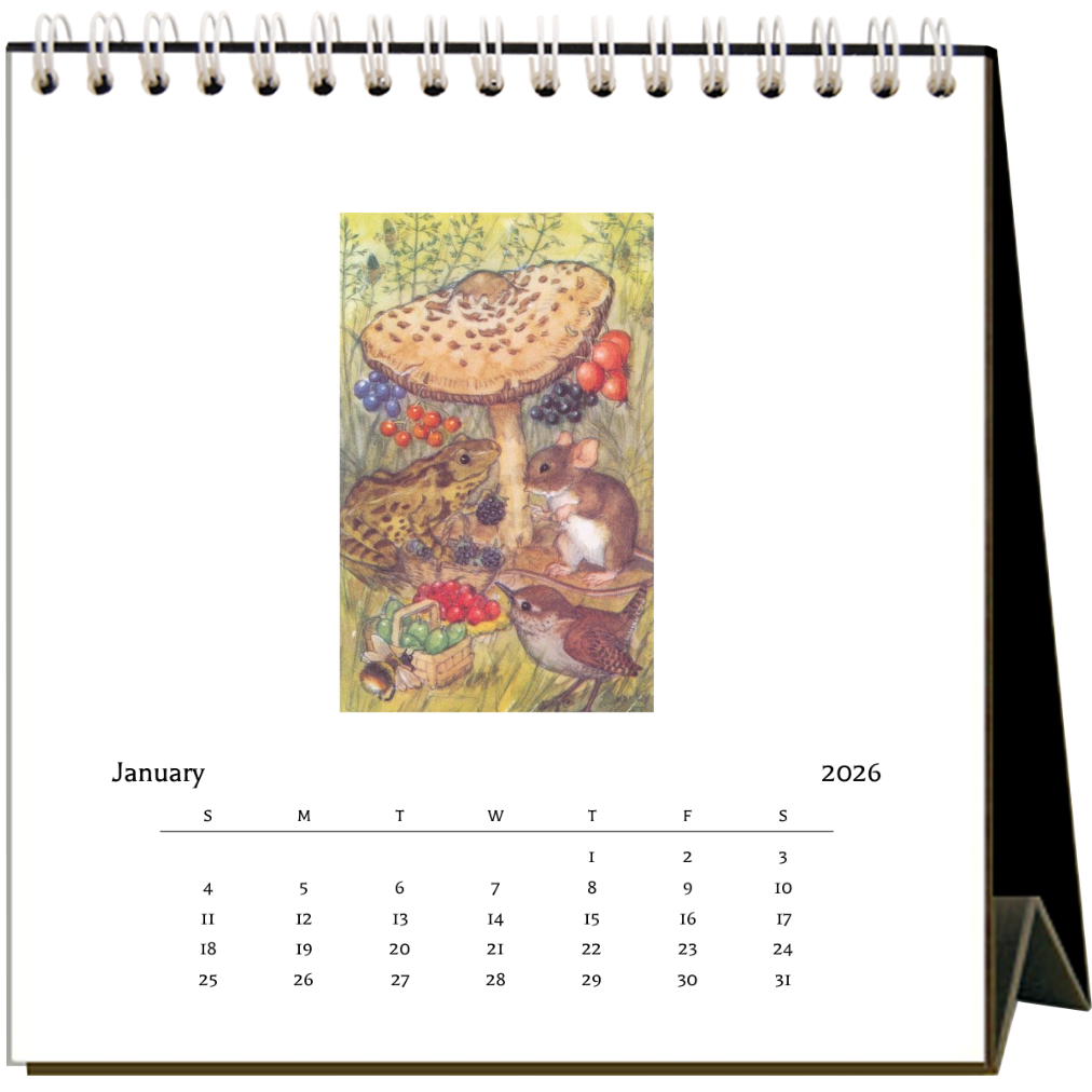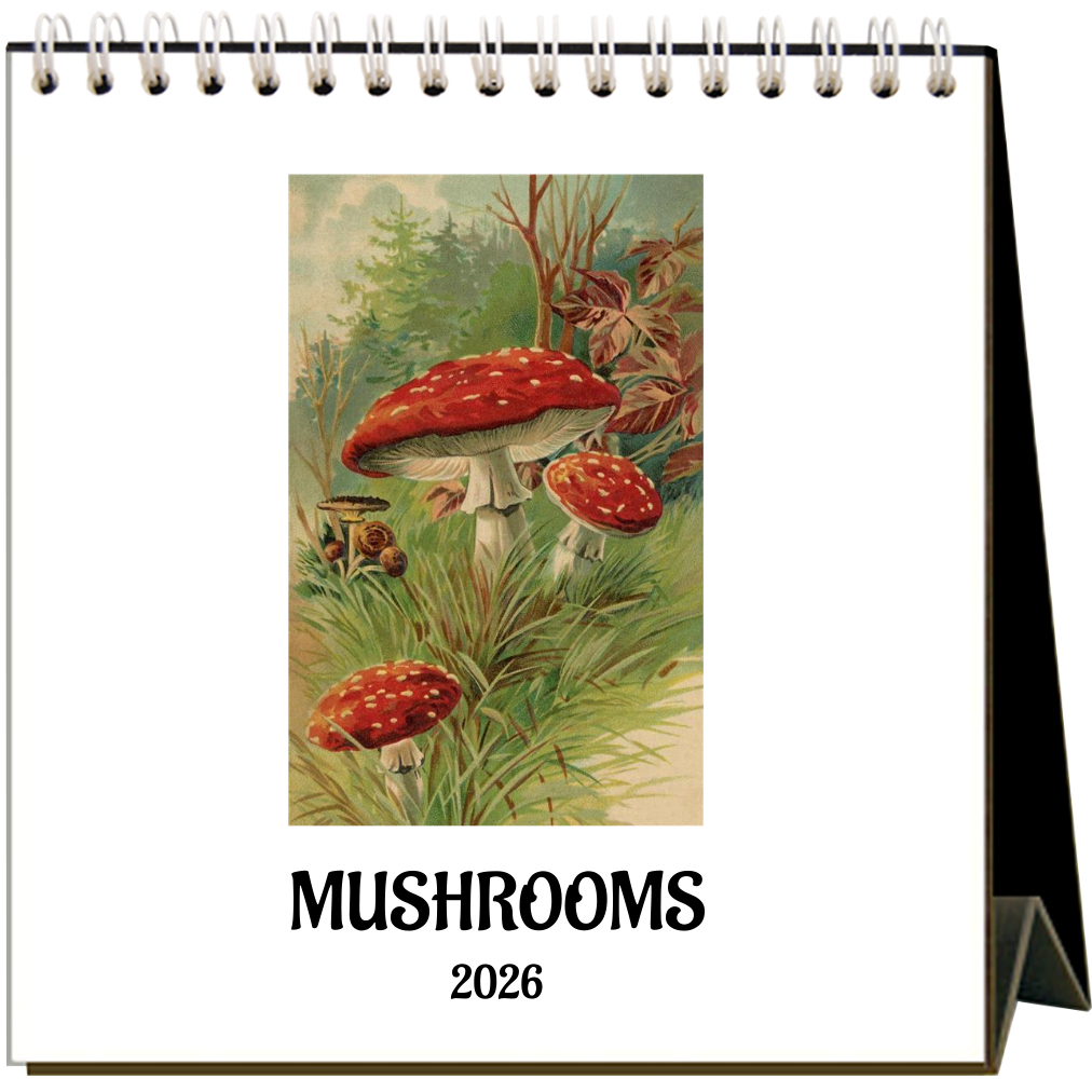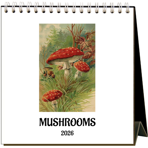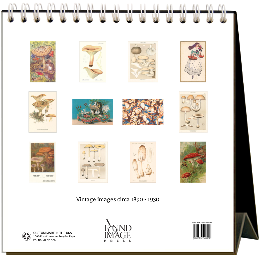 Mushroom lovers of the world, this easel desk calendar is for you. It features 12 vintage illustrations (1890 – 1930) of edible and poisonous Mushrooms, including Amanita, Shitaki, Lactarius, and shaggy ink cap. The calendar measures 6” x 7” x 3” when expanded and is printed on 100% post-consumer recycled, acid-free, natural white, heavy cardstock. Made in the USA.
