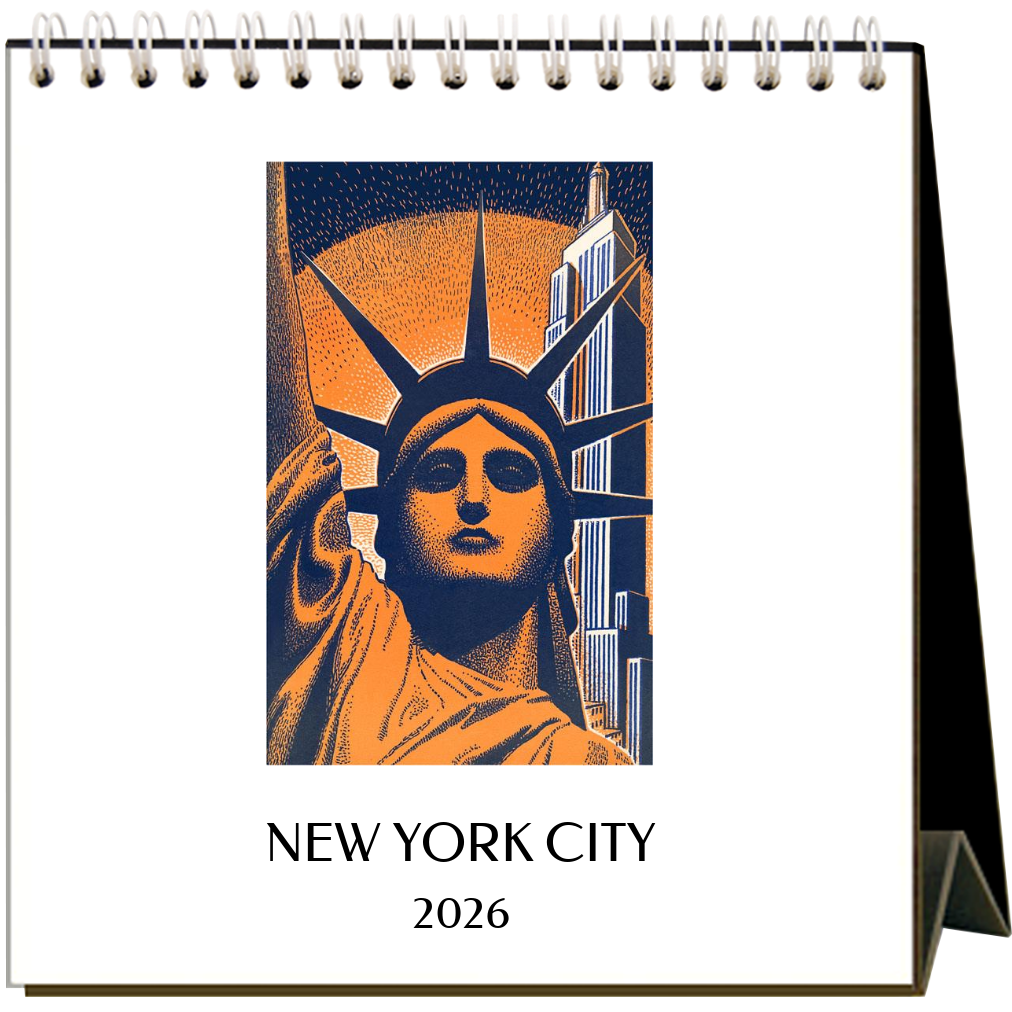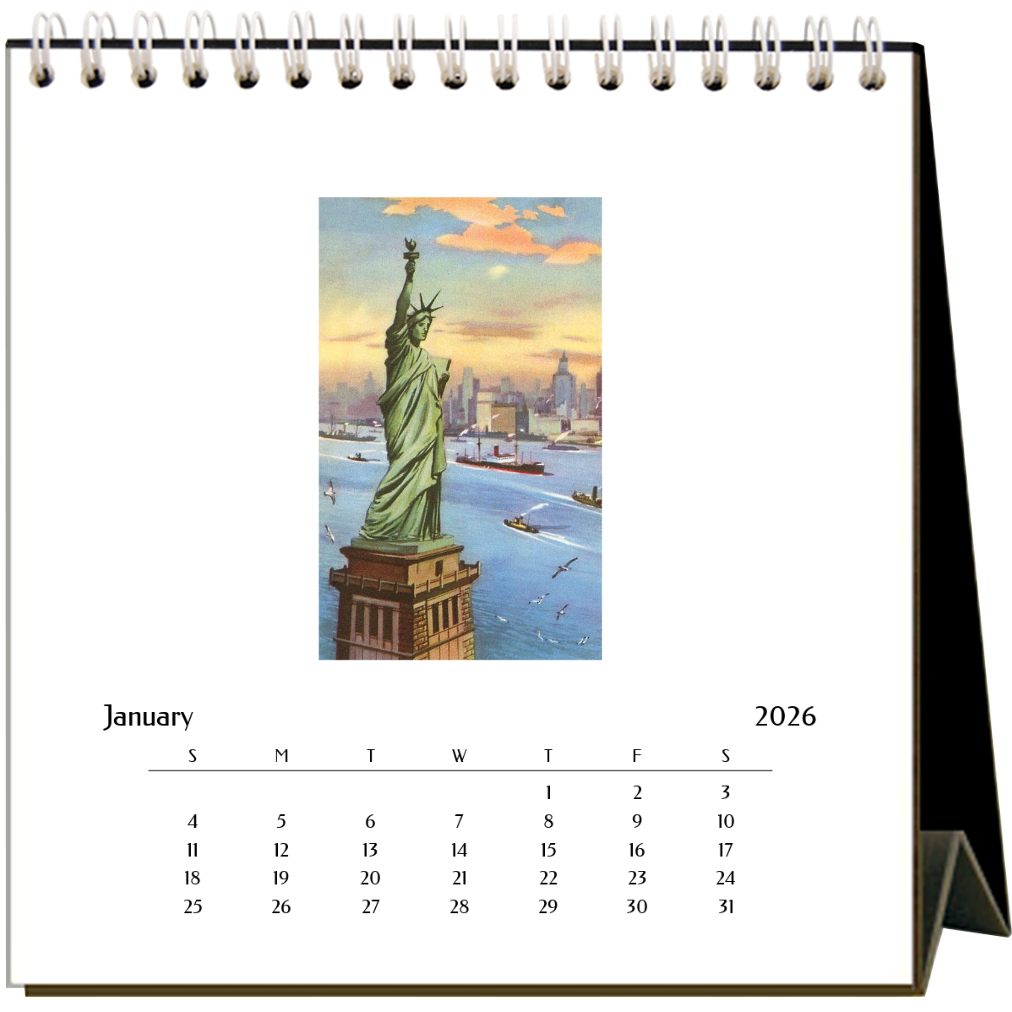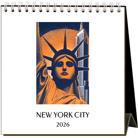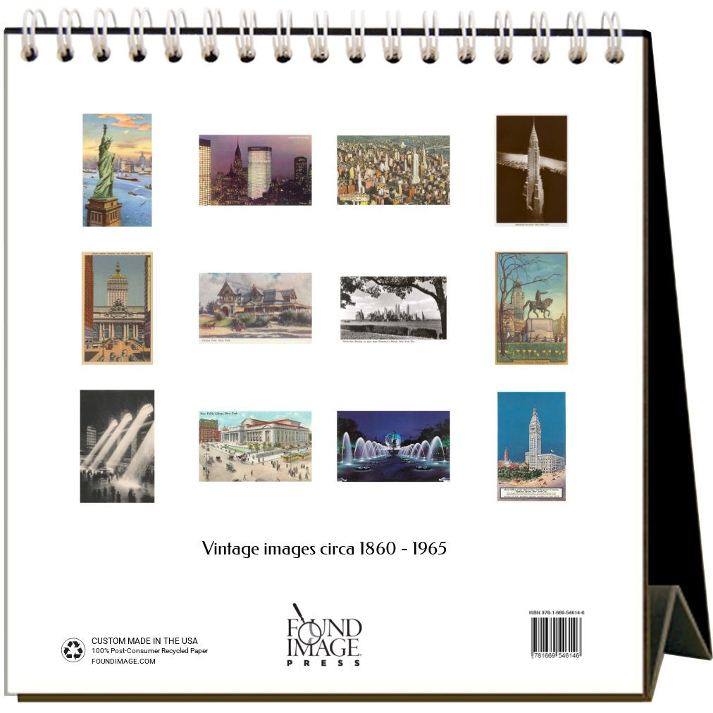 This New York City easel desk calendar features 12 vintage images (circa 1860 to 1965) of the best of The Big Apple. Union Square, the Chrysler Building, Statue of Liberty, Public Library, Central Park, and Grand Central Station – all at your fingertips! The calendar is printed on 100% post-consumer recycled, acid-free, natural white, heavy cardstock and measures 6” x 7” x 3” when expanded. Made in the USA!