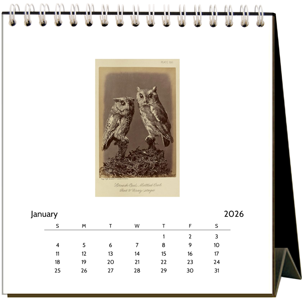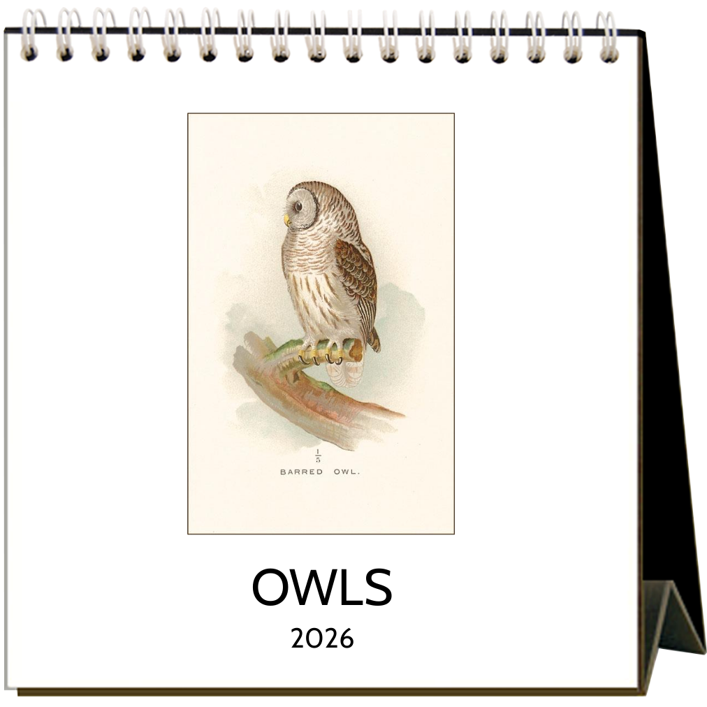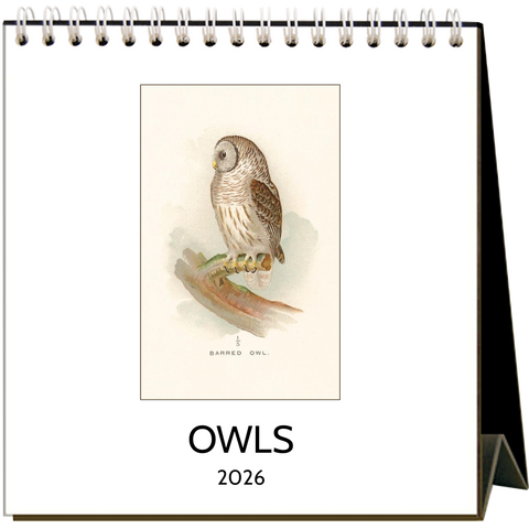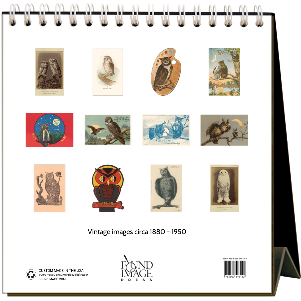 This Owls easel desk calendar celebrates that wise bird of prey, the owl. Featuring 12 vintage images from 1880 to 1950, this calendar is sure to delight all who love these nocturnal hunters, known for their silent flight and characteristic WHOOO call. The calendar is 6” x 7” x 3” when expanded and is printed on 100% post-consumer recycled, acid-free, natural white, heavy cardstock. Made in the USA!
