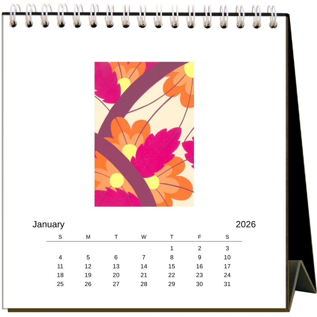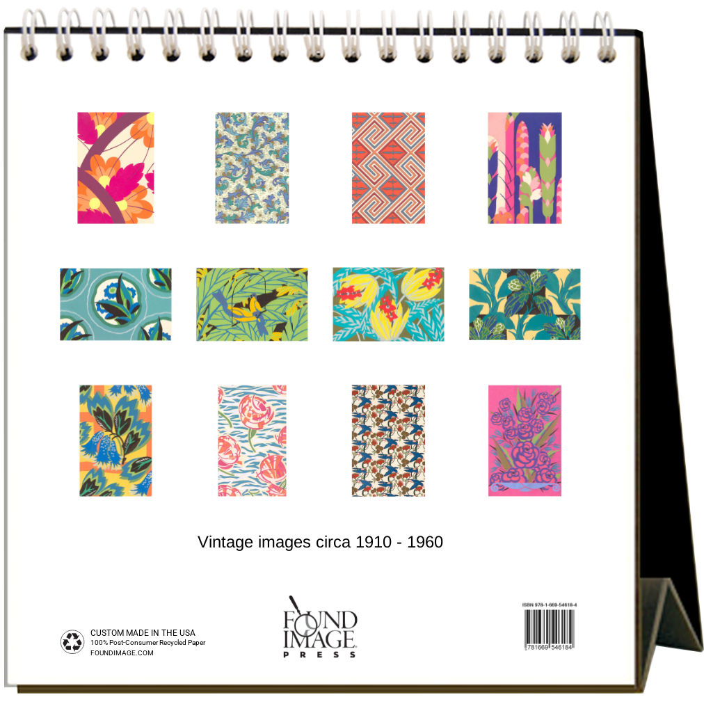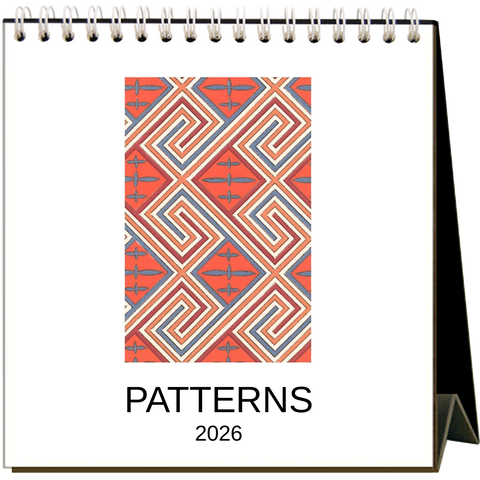 This easel desk calendar, with its colorful repeating Patterns, speaks to our inner need for beauty and order. It features 12 vintage geometric and floral patterned images from the 1910s to the 1960s and is printed on 100% post-consumer recycled, acid-free, natural white, heavy cardstock. 6" x 7" x 3" when expanded, it's made in the USA.