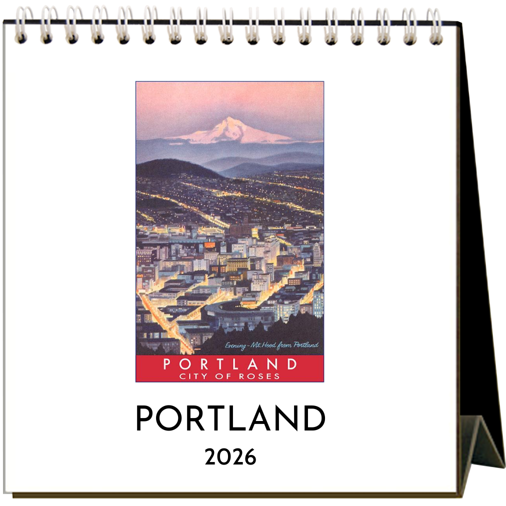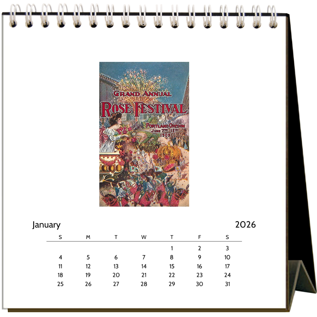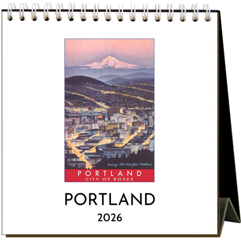 This easel desk calendar features 12 vintage images of Portland, Oregon from 1900 to 1960.  Mt. Hood, Lambert Gardens, City Park, and, of course, lots of roses and the Rose Festival – the historic city of Portland at your fingertips!  This calendar measures 6” x 7” x 3” when expanded and is printed on 100% post-consumer recycled, acid-free, natural white, heavy cardstock.  Made in the USA!