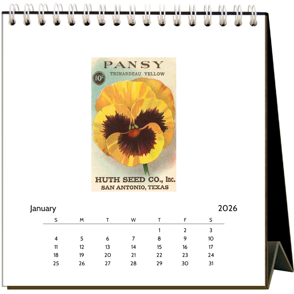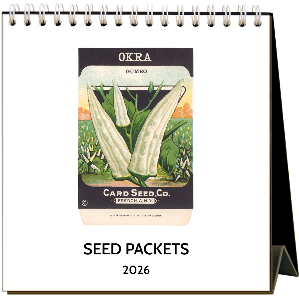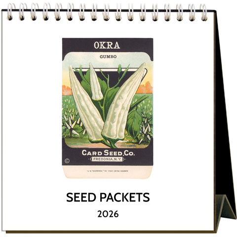 Want to grow your own luscious flowers and vegetables?  Or just fantasize about it?  This Seed Packets easel desk calendar will give you inspiration, or at least make you hungry for healthy fresh food and beautiful flowers.  It features 12 full-color vintage images of seed packets, circa 1920.  Big fat pumpkins, okra, corn, sunflowers, pansies, asters, and zinnias -- vegetables and flowers too good to be true!  This calendar is 6” x 7” x 3” when expanded and is printed on 100% post-consumer recycled, acid-free, natural white, heavy cardstock.  Made in the USA!