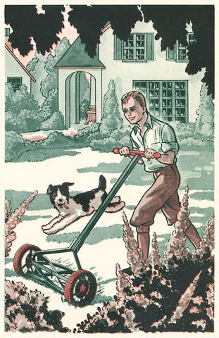 AM-121 Industrious Boy Mowing Lawn - Vintage Image