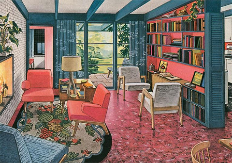 AD-230 Living Room with Book Shelves and Fireplace - Vintage Image
