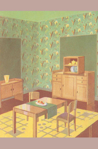 AD-712 Austere Dining Room with Green Wallpaper - Vintage Image
