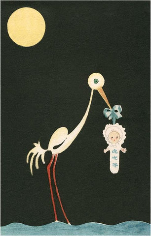 BY-75 Stork Hanging Baby over Moonlit Water - Vintage Image