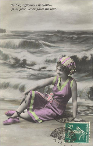 TS-107 French Woman Lounging on Beach - Vintage Image