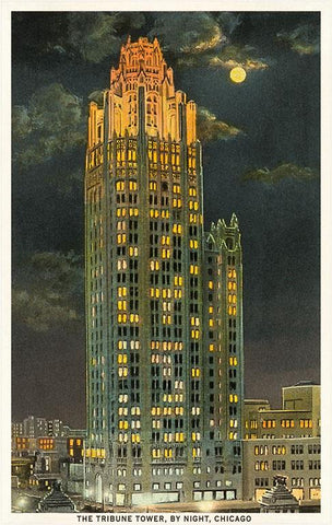 CH-65 Tribune Tower by Night, Chicago, Illinois - Vintage Image