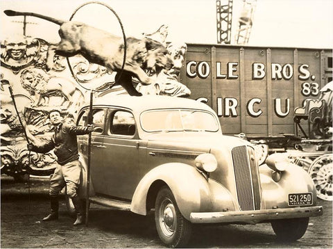 CI-76 Lion Jumping through Hoop onto Car - Vintage Image