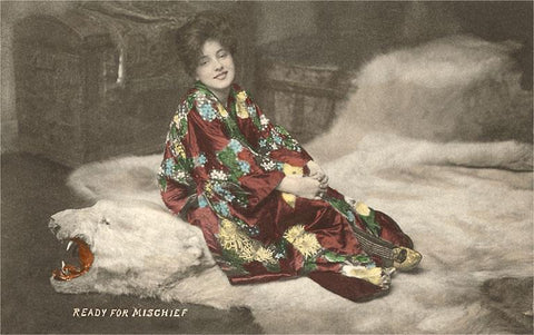 KU-44 Ready for Mischief, Woman in Kimono on Polar Bearskin Rug - Vintage Image