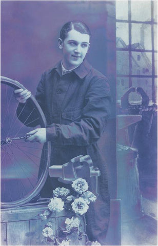 CY-50 Purplish Photo of Man with Bicycle Wheel - Vintage Image