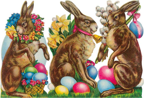 EA-113 Three Rabbits with Eggs and Flowers - Vintage Image