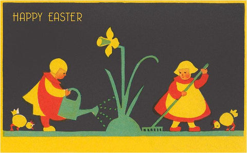 EA-148 Happy Easter, Dutch Children Watering Daffodil - Vintage Image