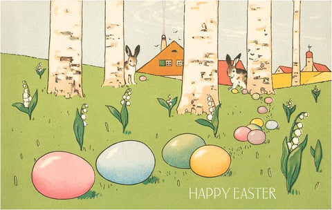 EA-155 Easter Bunnies and Eggs Amid Birch Trees - Vintage Image