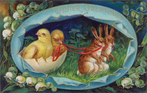 EA-301 Bunnies Pulling Chicks in Eggshell Carriage, Easter Greetings - Vintage Image
