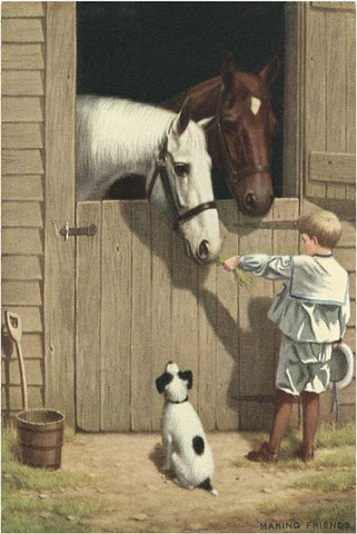 EQ-101 Little Boy Feeding Horses in Stable - Vintage Image