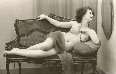 EX-45 Semi-nude Woman on Cane Divan Looking in Mirror - Vintage Image