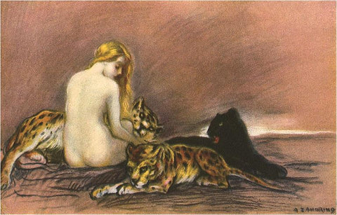 EX-108 Naked Woman with Leopards and Panther - Vintage Image