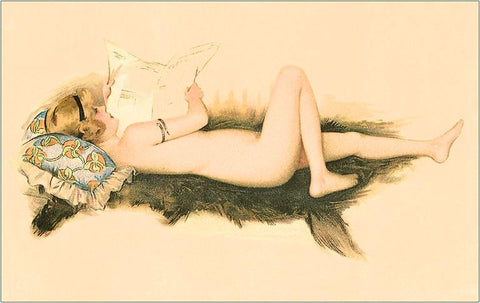 EX-130 Nude Reading Newspaper on Bearskin Rug - Vintage Image