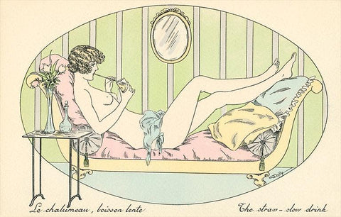 EX-147 Lounging Naked Woman Drinking through Straw - Vintage Image