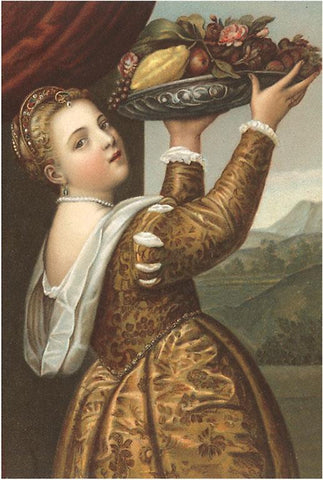 FO-76 Woman Holding up Fruit Platter Painting - Vintage Image