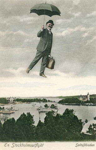 MF-452 Man with Umbrella Floating over Stockholm, Sweden - Vintage Image