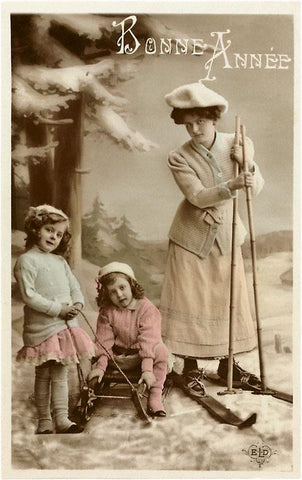 FE-21 Bonne Annee, Woman on Skis - Vintage Image
