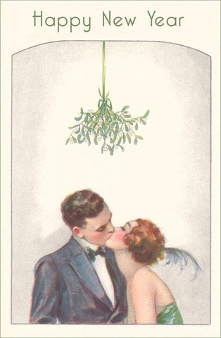HN-178 Happy New Year, Couple Kissing Under Mistletoe - Vintage Image
