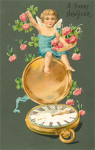HN-28 Happy New Year, Cherub with Clover and Watch - Vintage Image