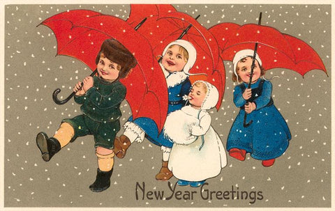 HN-37 Happy New Year, Children with Red Umbrellas - Vintage Image
