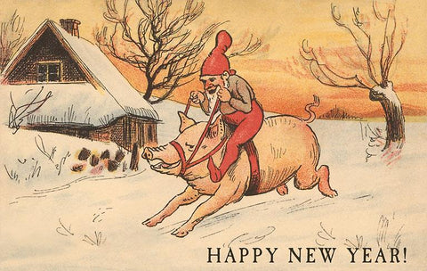HN-69 Happy New Year, Elf Riding Pig - Vintage Image