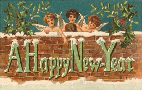 HN-102 A Happy New Year, Angels on Brick Wall - Vintage Image