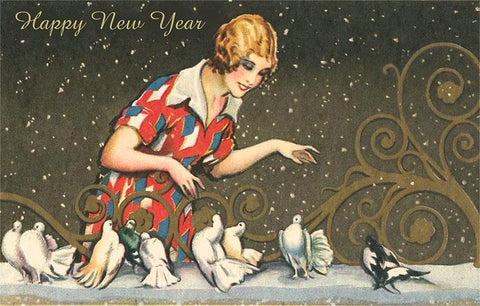 HN-171 Happy New Year, Woman with Pigeons - Vintage Image