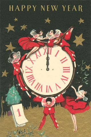 HN-186 Happy New Year, Clowns with Clock Face - Vintage Image