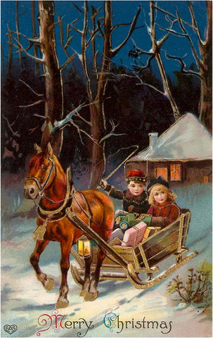 MC-109 Merry Christmas, Children in Sled at Night - Vintage Image