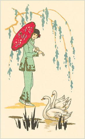 JN-141 Woman with Parasol and Swans - Vintage Image