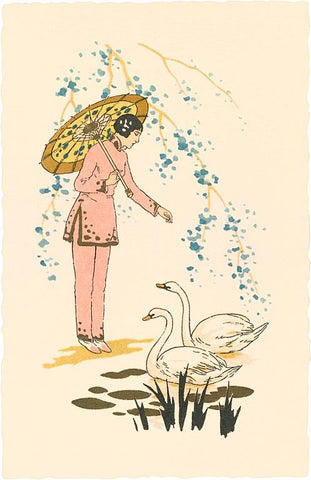 JN-160 Japanese Woman Feeding Swans - Vintage Image