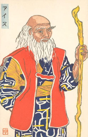 JN-161 Old Japanese Man with Staff - Vintage Image