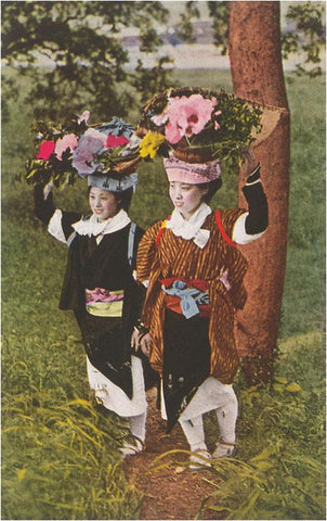 JN-172 Japanese Women with Flower Baskets on Heads - Vintage Image