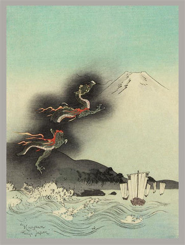 JN-198 Traditional Japanese Woodcut with Volcano Dragons - Vintage Image